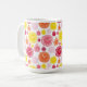 White ceramic mug featuring a pattern of colorful clocks and pocket watches in red, pink, yellow, and orange tones on a light background. Playful and vibrant.
