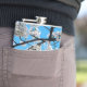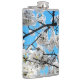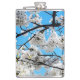 Flask with white cherry blossoms photographed against a clear, blue sky.