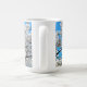 Coffee cup featuring white cherry blossom flowers photographed against a clear, blue sky.