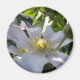Vackra vita clematis vinklade mot sol mot gröntens löv med ett tips om blå himmel på sidan.