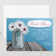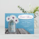 Söt och rustik land Mason Burk Inbjudningskort för möhippa med vit och lila daisy i burk, sitta med en rustisk träbord, med blå bakgrund. Mason burk har "Kärlek" präglat den.