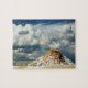 Ett foto av White Dome Geyser i nationalparken Yellowstone, med moln av regn i bakgrunden.