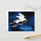 Anpassa det här unika vykortet för en typ! Den har en serenvit duva som flyger mellan stjärnor som bär en Olive Gren med flytande Silver Rosett band och som önskar alla..."Fred på jorden"!