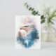 This breathtaking design features a majestic white eagle shown in a noble profile view, with its silhouette elegantly blending into a tranquil woodland scene. Created as a high-quality digital illustration in a soft watercolor style, the eagle has brilliant white plumage and a sharp, light-colored beak that conveys a sense of quiet power and watchful wisdom. The lower half of the eagle's form transitions into a dense grove of teal and deep blue evergreen trees, while a soft mist and glowing light orbs drift through the forest floor. Above the eagle, a warm sunset sky is filled with soft pink and orange clouds, shimmering white stars, and a small flock of birds flying in the distance. The overall aesthetic is peaceful, mysterious, and full of natural wonder, making it an exceptional choice for bird lovers and fans of double-exposure wildlife art. This elegant eagle postcard is a perfect choice for sending a meaningful "thinking of you" note or a powerful greeting to a friend who finds strength in the wild beauty of nature. You might choose to use this artistic card for a mountain-themed event invitation or to celebrate a professional achievement with a touch of noble elegance for your colleagues. It also makes a beautiful decorative piece for a modern rustic office wall or a stylish addition to a nature journal as a small token of forest magic. This versatile design is also an excellent choice for a housewarming message, a retirement thank you note, or as a heartwarming way to share a message of joy for any situation or event.