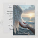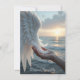 White feathers from an angel's wing gently glide into a woman's open hand. This takes place by the sea, with the setting sun in the background. A beautiful motif intended to offer comfort and hope when mourning the loss of a loved one.