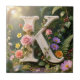This design is special because it features a glossy, cracked white letter K adorned with dew drops and immersed in a lush, sunlit garden setting. It is richly decorated with a vibrant array of soft pink and peach roses, purple flowers, and bright yellow blooms intertwined with green ferns and climbing vines. The composition is whimsical and rustic, making it perfect for a nursery, wedding, or nature-themed decor.