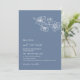 This elegant contemporary wedding invitation features white line art flowers and white script on a dusty blue background.