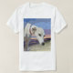 Bild är en vit Greyhound som ligger nära stranden i en oljefärgdesign.