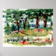 A house tucked in a forest with large windows that overlooks the rugged coastline of Mendocino, California with bright pink sweet peas in bloom hand drawn painted with watercolor. I like making drawings and paintings of places I've visited and really enjoyed. Plus, the area was filmed for "Murder, She Wrote" of which I am a big fan