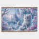 En vacker, drömmande fantasiscen med en vacker vit kattunge i ett magiskt vinterrike med ett spännande slott.