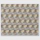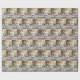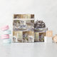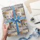 En flytande vit kattunge med påfallande blå ögon är kapslad i en blå och vit blommigt tekopp på en bordduk från snöre med glöd- mig- inte blommor som solfilter genom ett fönster