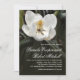 En fantastisk, modern bröllopsinbjudan med en vacker vit magnolia blommar på mörkens bakgrund. Vit text i ett höger-justerat format gör att contemporaryn blir attraktiv. Denna inbjudan är ett utmärkt val för vår och sommar-bröllop samt trädgård eller utomhus-bröllop. Redigera exempeltexten med information om bröllop. Du kan ändra ordalydelsen till kostym din personliga smak och preferenser.
