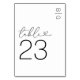 Minsta svarta och vita bröllop-bordsnummer med initialer i det övre hörnet av högerna, ord "bord" i ett elegant-skriptteckensnitt som innehåller ett kärlek-hjärta och talet.
