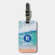 Anpassa vitt namn och monogram i blå cirkel på vackra strandscen. Kontaktinformation på baksidan.