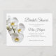 Vita orkidéer inbjudningskort för möhippan på vågrät pappert. Realistiska vita orkidéer med gultens centrum dekorerar den lämnat sidan av vit papper med mörk grått anpassningsbar text. Söt, underskattad design för ett tropiskt temat evenemang för att fira Briden. Mindre storlekt kort visas och kan ändras. Omvänd är fast grått.