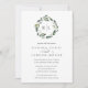Vår bröllopsinbjudan på vita Peony-gram omger initialer med en rund krans av målad vattenfärgsgrön, botaniskt löv och vit ros och blommor. Anpassa med dina bröllop-detaljer under i klassiskt brev.