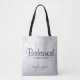 Den här vackra toteväskan är perfekt att tacka dina brudtärnor. Den har ett modernt svart skript som skriver över en bakgrund av blommor och hjärtan från vita peonymer. Texten är helt anpassade och lyder: Bridesmaid, med ställe för hennes namn, parets namn och bröllop datum. Perfekt för fyllning med bröllop-svag.