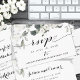 En subtil vit bröllopsinbjudan med en delikatmålad vattenfärg av vita blommigtar och eukalyptus greenergiy med ett svart sviktat kalligrafteckensnitt duo för den här onlinens OSA.