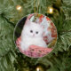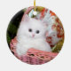Den vackra, vita persiska kattungen har hittat basket med Julklapp och gjort sig själv hemma hos katt som älskar julkeramiskt prydnadsföremål