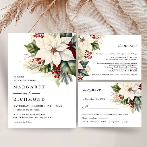 Inbjudan älskade dem till ditt magiska bröllop med vår "White Poinsettia & Red Berries Julbröllop!" Missa inte när du angav tonen för din speciella dag. Ta er i dag och gör din firande oförglömlig! #julbröllopInbjudan #PoinsettaWeddingInbjudan #WinterWeddingInbjudningar
