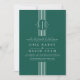 White rand och initialer, Veckogiga gröntens bröllopsinbjudan. Den visningar det vita lodrät rand i mitten med en cirkel med initialer och två små hjärtan och texten. Baksidan är av solid grönt färg.