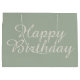 Fira i stil med denna stora sage grönt Grattis på födelsedagen-presentväska med elegant vit kalligrafi och en mates eller glansig avsluta för ett sofistikerat utseende. Dess tåliga konstruktion och mjuka handtag gör det till perfekt att hålla kläder, boxade gåvor eller många mindre artiklar. Perfekt för födelsedagar i alla åldrar är att den här tidslösa designen parar perfekt med att samordna blommigt eller strimlat vävnadspapper för en polerad presentation.