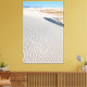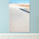 En panoramisk syn på nationalparken White Sands i New mexico, som visar de ikoniska vita gipssanddyner. Bilden fångar upp det mönster som vinden skapat på sanden och bildar mjukt och omger vågar. Dynerna sträcker sig ut mot horisonten, med ett avlägset bergsområde synligt i bakgrunden.