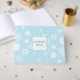 Söt Vinterbröllopsgäst bok, som är klar i ljusblå bakgrund, med vitt tittar snöflingor. Bilder av ett silver-glättat textområde har mörk-grått-redo som du kan anpassa för bröllop. Ändra bakgrunden till färg till kostym som bröllop behöver.