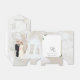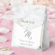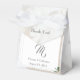 Vita Snöre och Ro Löv har ett tacksamhetsbudskap, ett monogram, namn av brud och grav och bröllop datum mot en vit baksida med faux-snöre-bakgrund. Grönt ro löv placeras på ett delikat sätt i kant. Bild av brud och triom som visas på baksidan. Mycket elegant. Underbar för bröllopsreceptioner eller möhippor.