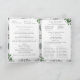 Design innehåller texten i det traditionella katolska Nuptial Mass-formatet som visas mot en vit bakgrund. Den katolska symbolen IHS med kor och handflatan grenar visas på framsidan. Bakgrunden innehåller bilden av det vita snöre. Grönt ro löv placeras delikatesi hörnen. Utrymme för upp till sju brudtärnor och Marskalkar. Baksidan innehåller anpassadets tacksamhetsbudskap och ett valfritt minnesmärke för de nära och kära som har passerat. Innehåller även utrymme för fotot. All text är anpassade. Designad för samordning med "White Snöre and Ro Lövs Bröllop Suite".
