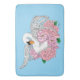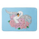 En vit svan omgiven av rosa blommor i en blå bakgrund