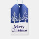 Juletiketter med vita gräs träd-silhuetter på snönära backe mot midnatt blå himmel och "God jul" hälsning. Exempelmeddelande vid omvänd text som ska ersättas med din egen text.