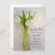 Klassen White Tulips i Spara datum meddelande vid Mjölk Flaska i Vår bröllop är en elegant för ceremonin och mottagningen vid vårinsatsen i giftermål i mars, april eller maj. Den här eleganten blomstrar den blommigt anpassningsbarna under den kritiska behållan med datumangivelsen ett fotografi av blommar av vita tulpanblommor i en vintage av möhippa av glas mjölk flaska och vit med vit satin. Finns som en utskriven inbjudan att skicka eller som en digital nedladdning för att enkelt kunna dela digitalt online.