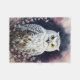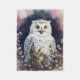 Täckande blommigt aviära porträtt-teckningar har ett vitt uggla med svarta märken som liknar ett snöstrå uggla, inramat av blommar växter mot ett nattvarg himlar. Ett coola färg-schema med midnattblått och mauve kombinerat med botaniskt inslag och en kräpfågel.
