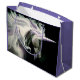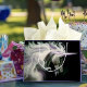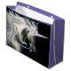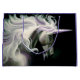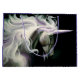 En profil av vit enmajs med lila i mane mot bakgrund av svart