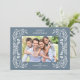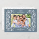 Det här vågrät har ett dammigt blått julkort med en elegant vit vinter-grön illustration som visar att ramar fotografiet.