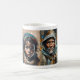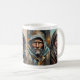 This compelling 11oz ceramic coffee mug draws from the Parable of the Good Samaritan (Luke 10:29), featuring emotive watercolor-style portraits that challenge "Who is my neighbor?". One side shows a wide-eyed children in a colorful headscarf against a desert backdrop, while the other depicts a weathered homeless man clutching a tin cup amid urban shadows, with a hooded elder adding depth to the theme of compassion.