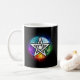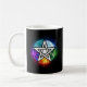 Artiskt ritad, ljuspentagram med fem magiska inslag, vatten, jord, eld, stral, luft på svart bakgrund. Wiccan pentagram. Wicca