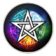 Artiskt ritad, ljuspentagram med fem magiska inslag, vatten, jord, eld, stral, luft på svart bakgrund. Wiccan pentagram. Wicca