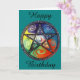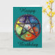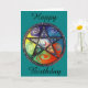 A5 pekade stjärnan cirklar med pagan symboler för jord, luftar, avfyrar in, vatten och anden. Kortet läser: Grattis på födelsedagen.