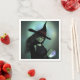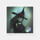 En leende häxa klädd i svart klädd med en hög svart hatt kastar en glödande orbstavelse.