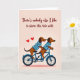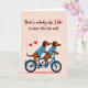 This greeting card shows two brown dachshunds riding together on a bright blue tandem bicycle, right in the center of the design. Both dogs wear matching striped shirts, and they look happy with wide eyes and sweet smiles, with one dog’s tongue hanging out. Two red hearts float above the dog in front, adding a clear romantic touch ❤️. The background is a soft, pale peach color that keeps the focus on the dogs and the bike. At the top of the card, there’s a message in a flowing script that reads, “There’s nobody else I like to share this ride with.” Overall, it feels like a warm note about sticking together, whether it’s love or close friendship 🍫.