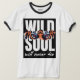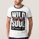 This image features a white t-shirt with a black ringer collar and sleeves. The front of the shirt displays a bold graphic design centered on a black rectangular background. The design prominently features the intense eyes of a tiger, rendered in vibrant orange, black, and white, with piercing red irises. Above the tiger's eyes, the word "WILD" is printed in large, white, sans-serif capital letters. Below the eyes, the word "SOUL is similarly printed in large, white, sans-serif capital letters. Underneath "SOUL," the phrase "will never die" is written in a smaller, white, cursive font. The overall design evokes a sense of untamed spirit and resilience.