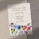 Wildblomma bröllop spara datum-kort med blommor i vilden med foto och vattenfärg. Denna botaniska utformning i land har en söt gräns av vilda blommor, inklusive baljväxter av daisy, blomkoppsfrökonfektion av knölar av svärdfisk och klöver. En elegant modern blommigt med giftigt, bohemiskt trädgårdstema. Bläddra i min butik i samlingen Wildblomma Charm för matchande artiklar.