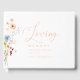 Minimalistisk illustration av vilda blommor "In Loving Memory" firande av livet, begravningsgäst bok, elegant, underbart handskriftsteckensnitt, vitt, orange, pastel.