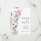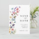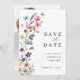 Ett modernt och elegant bröllop sparar datumet i vår sommarens vildblomma. Med färgstark vattenfärgspersika, rosa, lavender, gult och dammiga blå blommigtar och botaniskt med fjäril och dragonfly. Den har ett monogram och en redigerbar bröllop-webbplats och foto längst bak. Du kan ta bort text om det inte behövs.