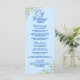 Informera dina gäster om alla detaljer på menyn med en blommigt som är mycket exakt mot en ljusblå blått. Det här menykortet är elegant och sofistikerat och lovar att uppmuntra dina gäster med goda detaljer. Komplettera ditt tema med en omfattande bröllop-svit som stämmer överens med den här designen, och som håller sig trogen din vildblomsmotiv.