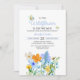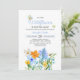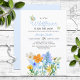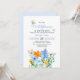 Söt och summerisk "liten vildblomma är på väg": inbjudningar till babydusch. Med vackra blåa, vita, orange och gult vattenfärgblommor.