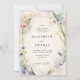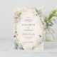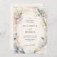 Fintvätt av vilda blommor och lush grey, målad i mjuk vattenfärg med tonerna lila, lavender, rosa och grönt, intertwine på ett skonsamt sätt mot en bakgrund som skapar en elegant blommigt ram för denna bröllopsinbjudan. Utformningen är en tidlös blandning av klassisk sofistikering och en lekfull charm av vilda blommor, perfekt för modern romantik. Idealisk för en vår eller sommar, eller till och med fall eller vinterbröllop, inbjuder detta kostym både den elegant bohemiske bruden och dem som planerar en trädgårdsken, bakgården firande eller ett formellt evenemang i en château trädgård. Ett vackert val för brudar som söker en liten bit av naturens stollig med finare elegans.