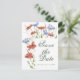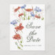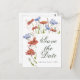 Spara vykortet för datum som innehåller en kaskad med våtfärgade vildblommor som röda poppies blå kornblommor och gräs.